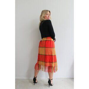 This one is a beauty! Late 60's, Early 1970's Pendleton Pure wool skirt in women's size xs to smaller small. High fixed waistband with double button closure at the waist and full button front. Long fringe edge. Skirt is unlined. Fabric is a thicker wool flannel in a bold orange, marigold and green plaid print. In excellent, near mint vintage condition with no flaws to note.