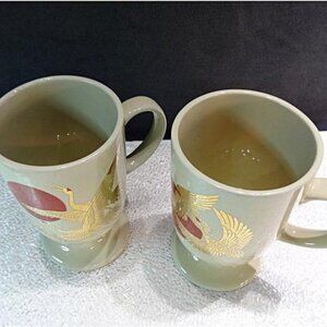 These ivory white porcelain mugs are footed tall mugs ; perfect for a big cup or tea, coffee, or hot chocolate. The flying cranes are hand painted in 22kt gold. These mugs have been stored away for decades and have never been used.