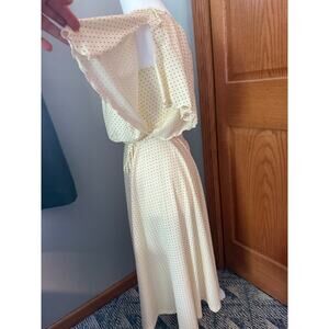 This vintage Terri Juniors California Polka Dot dress in pale yellow is flattering and fun! Light weight material open shoulder sleeves with cute ties at the top. The dress has a tie waist and has elastic at the waist for the perfect fit. Features a zipper closure in the back. This dress has been laundered. There is no size tag so please refer to measurements. It came from a wardrobe with mostly size 5.