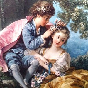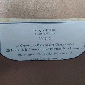 This is a lovely vintage 1970’s wooden gilt frame. It has beautifully carved accents on the top, bottom, and both sides and a beading all the way around. It is Victorian in style. It was purchased at the Frick Museum in New York City.  It is entitled Spring, an illustrated copy from French Boucher.