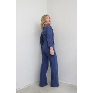1970's Denim jumpsuit with the best fit in women's size xs to sm. Zips up the front, chest pockets and collared neckline. Shoulder epaulettes and attached belt at the elastic back waistband. Wide leg with raw edge hemline. Fabric is a medium weight cotton denim in a dark blue wash. In excellent vintage condition with some overall fabric fade and just the right amount of wear.