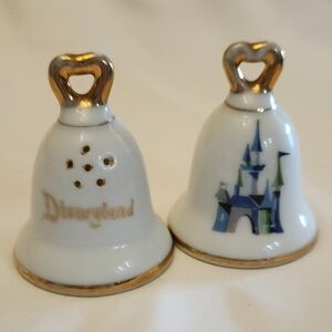 Adorable vintage Disney salt and pepper shakers with Disney castle on one shaker and Tinker Bell on the other. Both shakers have stoppers and are in good condition with no knicks but some discoloration/wear of the gold trim on bottom edge of tinker bell shaker and on both heart shaped handles on top, pictures posted to show.