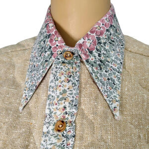 1970s Western Cream Floral Print Patchwork Quilted Yoke Button Up Shirt by Alfie California. Long floral sleeve with quilted wrist cuffs. Wrists secure with two wood buttons. Six wood buttons run up the front. Long wing tips. Rounded hemline.