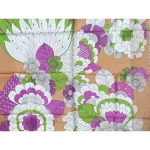 Rich & eye-catching, oversized purple, green & white pop art floral design on a light brown background square scarf circa 1970s. Unsigned, it measures 27 inches wide by 27 inches tall & the tag reads: