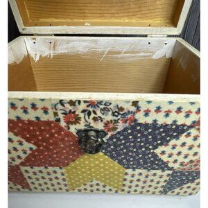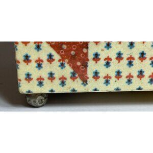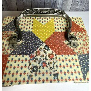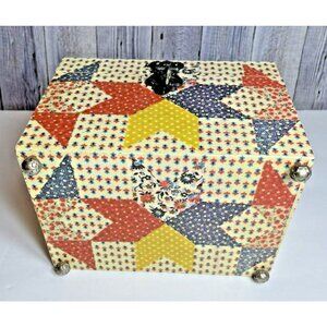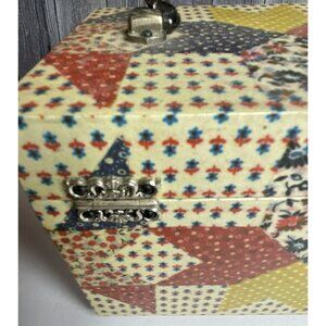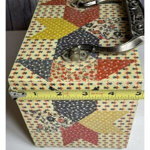 1970s Trinket Case Box Patchwork Design 7" x 5.5" x 5" with handle - cute box in good condition. Has feet on the bottom and a latch closure. Please see all photos, they are part of the description.