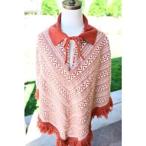 1970's Wool Burnt Orange and Cream Knit Poncho with fringe