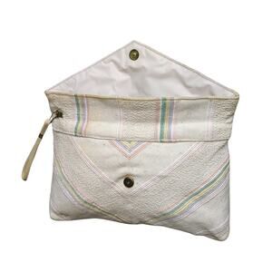 1970s Woven Fold Down Maxi Clutch Wristlet Textured Rainbow Pastel Colors Plastic Lining. Magnetic round closure. Matching fabric wristlet loop.