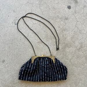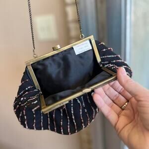 beaded clutch, viscose purse, brass chain, vintage accessory, retro bag, 1970s style, embellished handbag, soft textile, well-crafted beadwork, long strap