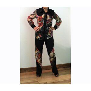 This amazing 1970s bell bottom pants outfit is so unique! It would be great for performing, cruising, or any other occasion when you want to stand out from the crowd, but also be comfortable. The blouse is sheer, with an amazing floral print of wild flowers. It could be worn open, with a tank or cami, or closed as shown. It has a southwestern flair to it. The floral fabric is also repeated in bands that are sewn onto the pants, so that section of the pants is sheer as well. Made of 100% polyester. The pants have a set-in waist band and a zipper and button closure in the back. A very iconic 70s ensemble! Made by Estivo. Vintage size 11/12. No flaws noted.