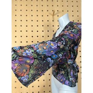 Vintage 70s floral wrap top with wide bell sleeves, bold floral print