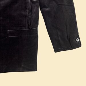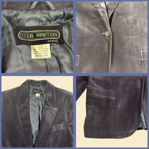 Vintage womens velvet/velour blazer suit jacket, manufactured ca. 1970s-1980s by Club Nineteen. Dark grey jacket with three front pockets and a button closure, with a medium thickness. Size 14.