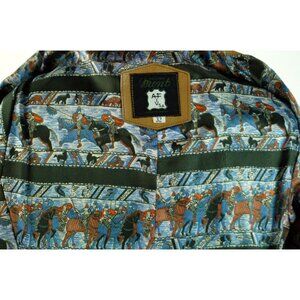 Excellent leather jacket in a camel color with wide, notched collar, covered buttons and pockets with cool flaps. The leather has a sheen to it and is a very good quality. There's a back belt and a deep V vent in back. The lining is wonderful - an Medieval equestrian theme with riders in helmets with shields and spears. It's fully lined. Made by Mont. Size 32. Very good condition.