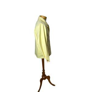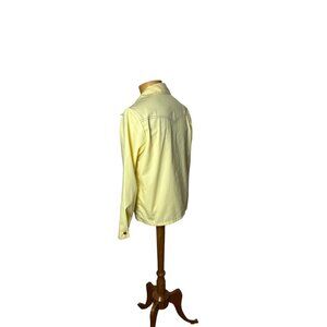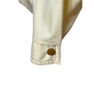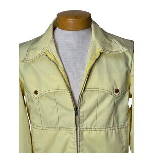 Fantastic 70s windbreaker made of water repellent fabric in a medium yellow, with brown top stitching. It's got a western look to it, with the snap detail (non-functional) and top stitching, front and back. There are two pockets which are cleverly disguised . The cuffs close with a brass snap. The jacket closes with a sturdy silver zipper. Made by Manstyle. Tag says size 40 but I measured chest, pit to pit at 42". Fabric is a woven light weight but sturdy canvas-like material, 65% polyester, 35% cotton. Very good condition.