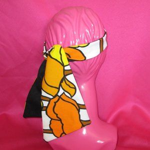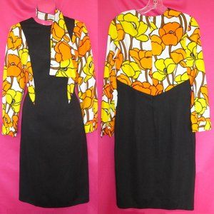 1 snag on front/back/scarf,1 cuff button missing. 1970s mod orange black brady dress + headband size large lbd groovy 70s polyester floral yellow brown flowers colorblock matching 12 set boho hippie hippy matching set coord co ord suit