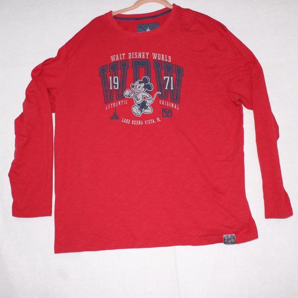 This stylish Disney long sleeve shirt features the iconic Mickey Mouse character in a bold red color. Made for adults in a unisex style, this shirt is perfect for any Disney fan looking to add some magic to their wardrobe. The shirt comes in size 2XL and is made from high-quality materials ensuring both comfort and durability. Ideal for collectors, this shirt belongs to the Disney Parks and collectibles category, making it a must-have for any Disney enthusiast. Whether you're wearing it to a theme park or for a casual day out, this shirt is sure to turn heads. Celebrate your love for all things Disney with this charming Mickey Mouse shirt! Length 31.5in, pit to pit 25.5.
