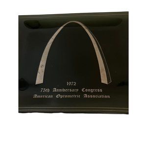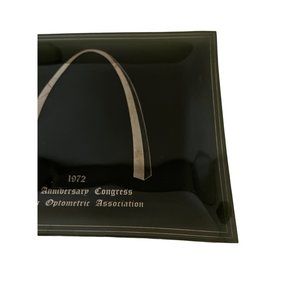 Vintage 1972 smoked glass trinket dish commemorating the 7th Anniversary Congress of the American Optometric Assocation. The event was held in St. Louis, Missouri so the trinket dish features an image of the Gateway Arch. The dish measures approximately 8.75" x 6.75".