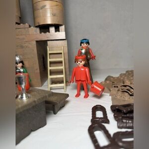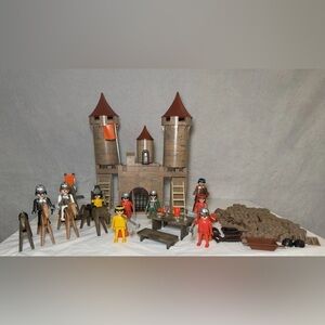 The product is a vintage Geobra Playmobil Medieval Castle with figures, horses and many accessories from the 1970s. This PLAYMOBIL toys offers hours of imaginative play opportunities for children. The set includes a variety of characters and animals that can be used to create medieval scenes and adventures. Perfect for collectors or those looking to expand their PLAYMOBIL collection with nostalgic pieces from the early 1970s. Not certain the set is complete. Includes everything pictured. All are in excellent condition.