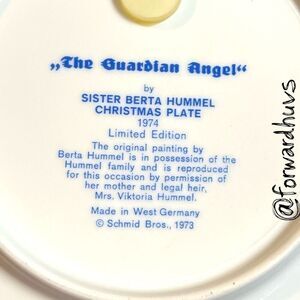 This vintage porcelain plate titled “The Guardian Angel” is part of the annual Christmas series by Sister Berta Hummel, distributed by Schmid Bros. Inc. The front illustration features a tender scene of an angel in a star-adorned robe gently guiding a child by the hand through a peaceful winter landscape.