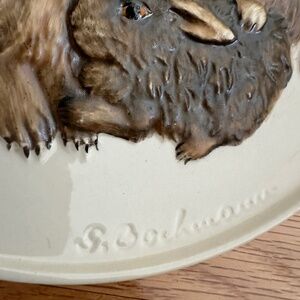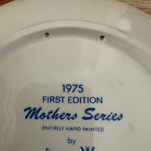 1975 First Edition Mothers Series Rabbit Plate Goebel W Germany with Box. Produced in 1975 for Mother's Day by Goebel, the plate is handpainted, featuring a mother rabbit and her two babies. 2 holes in center of back to thread wire or string for hanging purposes. S. Bochmann imprinted on lower edge. The plate is in excellent condition with no chips or cracks. 7 1/2" diameter. Includes original box and protective insert.