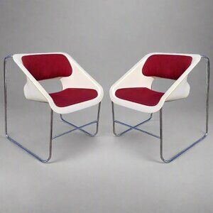 1976 Gorgeous space age set of two "Lotus" stackable chairs by Paul Boulva for Artopex in chrome, bordeaux fabric and fiberglass. Made in Canada. The items are in excellent condition. (The price is for the both)