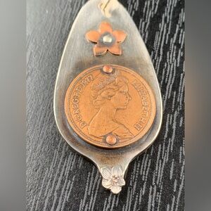 Artisan Spoon/Coin Pendant! Handcrafted from an antique (Orange Blossom pattern circa 1910) spoon bowl with ornate flower from the spoon handle still intact. It features a copper riveted flower and vintage genuine 1977 English Elizabeth the II coin also securely riveted on. I believe it is copper and an English pence /penny. This coin celebrates the queen’s jubilee. Made into an artsy OOAK gorgeous pendant or can even be used as a keychain perhaps! Just the pendant; no chain is included.