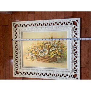 This 1977 Homco DART molded plastic wall art, featuring a vibrant basket of daisies, brings a splash of retro flair to any space. Measuring 21x18, its yellow and white hues add a cheerful touch.
