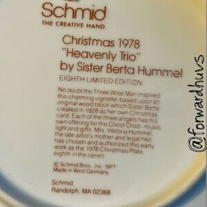 Celebrate the charm of vintage holiday artistry with this 1978 limited edition Christmas plate titled “Heavenly Trio”, designed by Sister Berta Hummel and distributed by Schmid Bros. Inc. This is the eighth plate in the annual series, inspired by an original woodblock illustration created by Sister Hummel in 1928 as her personal Christmas card.