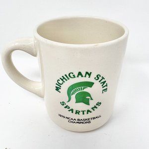 Vintage Michigan State Spartans coffee mug of the NCAA 1979 basketball champions. This cream and green commemorative mug celebrates the March 26th 1979 basketball championship of MSU over ISU scoring 75 to 64. The mug was made in the USA (stamped into the base) and was sponsored by Red Lobster Inns of America. It is pre-owned and is in very good condition.