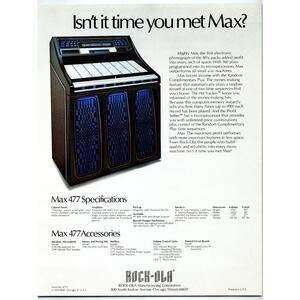 This vintage 1979 brochure features the Rock-Ola Model 477, a compact electronic jukebox known as "Max". Promoted as the first electronic phonograph of the 1980s, this music machine boasted 160 plays in the space of 100, leveraging microprocessor technology for enhanced performance. The flyer highlights innovative features such as the Random Complimentary Play, Hit Tracker, and Profit Setter, which helped optimize play sequences and maximize revenue for operators.