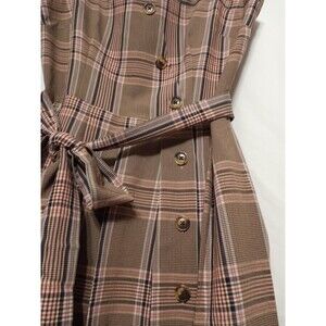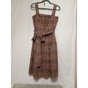 Anthropologie's Gal Meets Glam Madison Tie-Front Mini Dress is a brown plaid A-line dress made of a rayon blend material. It features a square neckline, sleeveless design, and a knee-length hem. The dress has a tie closure and is available in size 10. The dress is new with tags and is not handmade or vintage. The dress is suitable for casual occasions and can be worn in all seasons. The brand is Anthropologie and the dress is not personalized.