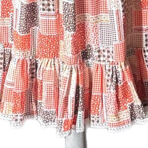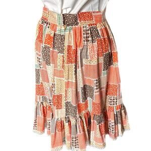 1980 handmade multi pattern knee length skirt with ruffle hem trimmed in lace.