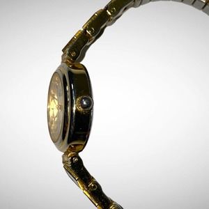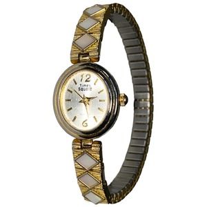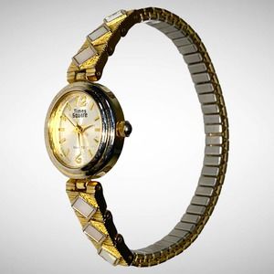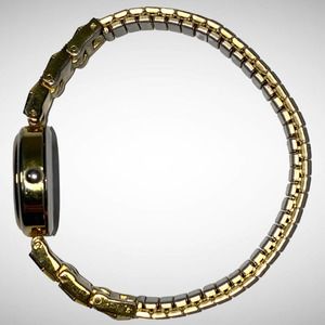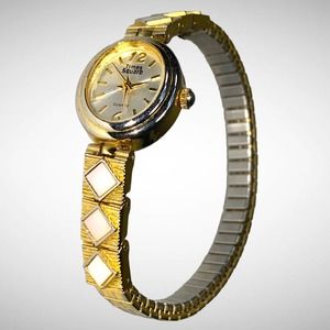 Pearlescent oval watch face with 3 geometric diamond shapes in Mother of Pearl tone above and below it along a gold band. Sweet, dainty little vintage timepiece. Wrist band is stretch and expands from 6.5 inches to approximately 8 inches. Japan quartz movement. In good condition with minimal scratches to watch face glass. Needs new battery, cannot be sure watch works- replaced battery likely is all that is required.