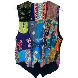 1980S-90S VIBRANT PATCHWORK RAYON VEST METAL COIN BUTTONS Size Medium