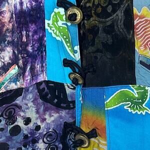 1980S-90S VIBRANT PATCHWORK RAYON VEST METAL COIN BUTTONS. Boho, Festival ready.