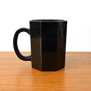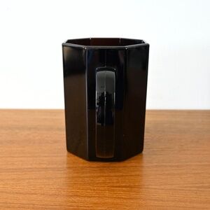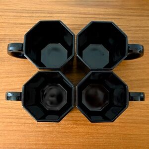 Black glass octagonal mugs from Arcoroc's "Octime" collection. These look like opaque black mugs until you hold them up to the light! They comfortably hold 8 oz.