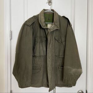 Good used condition, significant sun damage on the left side and some paint stains, everything should be visible in the photos. The size isn’t labeled but shoulder to shoulder measurement is 21 inches, pit to pit 23 inches, and length is approximately 28 inches. Zipper and buttons work.