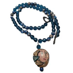 1980s Blue Artisan Crafted Polymer Clay Bead Face Leaves Pull Through Closure Necklace