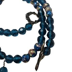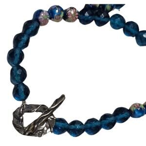 1980s Blue Artisan Crafted Polymer Clay Bead Face Leaves Pull Through Closure. Individual beads are a mixture of faceted glass and painted glass. Seems to be strung on wire.