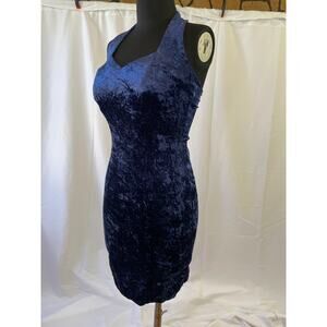 Vintage velvet bombshell moment 💙 This 1980s All That Jazz crushed velvet halter dress is a total showstopper. Made in a lush midnight blue stretch velvet, it features a flattering sweetheart neckline, curve-hugging fit, and halter neck with two-button closure. The interior has light boning on one side for a touch of bust support—please note, the right side boning was slightly bent from storage, but has been reshaped and is barely noticeable.
