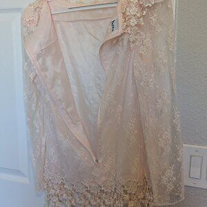 - Fabric: Sheer floral lace in a soft blush pink, fully lined through the body for opacity, with unlined sleeves that remain sheer and delicate.