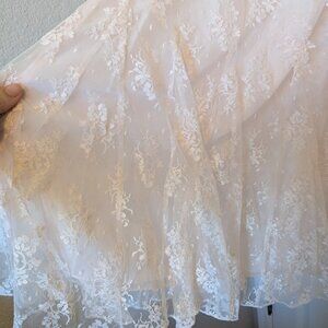 - Fabric: Same blush pink lace overlay, fully lined in a soft satin. The lining stops just short of the hem, allowing the lace to extend and flutter.