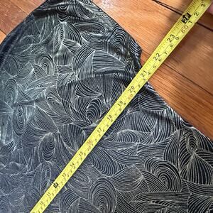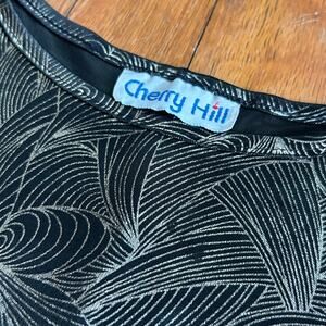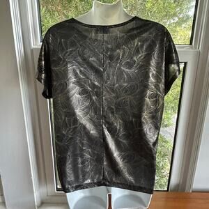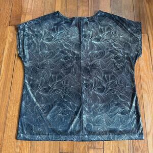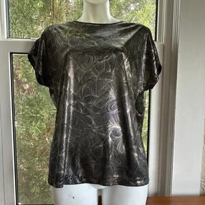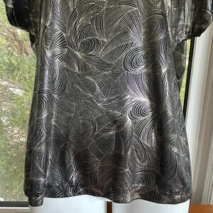 Vintage 1980s Cherry Hill blouse featuring a bold metallic abstract swirl pattern. The fabric shimmers mainly in silver with soft gold tones that appear under certain lighting, giving it a glamorous two-tone effect. Lightweight with a relaxed drape, this top embodies classic 1980s evening style—perfect for parties, holiday events, or dressing up a casual look with vintage flair.