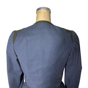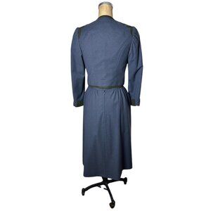 Beautiful wool suit by Christa-Moden, Salzburg in a cadet blue and loden green colorway. The ensemble resembles traditional Austrian dress, with the cropped jacket and gathered skirt. The jacket features puffed sleeves, green piping, turned up cuffs and appliques at the shoulders. It buttons in front with bone buttons and has a tab that can be moved to whichever button setting you like. It has a very pretty lining. skirt is slightly gathered and has an invisible zipper up the back. There are pockets on each hip. It is unlined. The set is in very good condition.