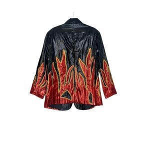 This amazing blazer appears to be custom made, as no size tag is attached. No info could be found on the label attached. The drop shoulders which are lightly padded indicate it is a 1980’s garment. Shiny woven fabric with ric-rac trim. Red flame design on black background. It is AMAZING! Fully lined, single button closure, some signs of light wear.