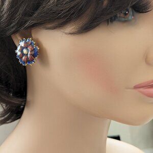 1980s Enamel Flower Pierced Post Earrings Purple Blue Glam Diva Artsy Gold Plt
