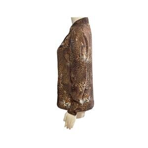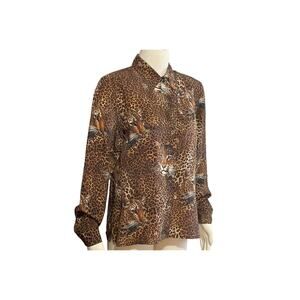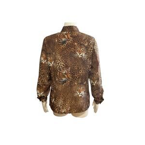 Soft & flowing silk like blouse covered with leopard heads & leopard print with pointed collar, slightly padded shoulders, straight hem, front button and cuff closure circa late 1980's, early 1990's