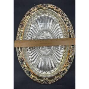 Measuring 16" x 12", the ornate outer tray holds a pristine 13" x 9" glass liner with five compartments—perfect for relishes, hors d'oeuvres, or crudités.