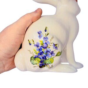 1980s Hand Painted White Rabbit Figurine Purple Violets Flowers Signed Ceramic