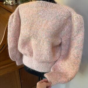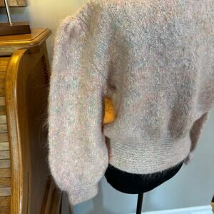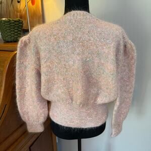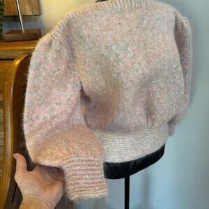 1980’s vintage pink handmade sweater that features puffed sleeves and shoulders with a tight waistband. So classically represents the era with its flawless craftsmanship.