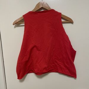 Fun vintage cropped T-shirt. Red with yellow lettering. From 1988. This shirt has been cropped in the style of 80s male at the gym lol. Measurements are included. From a smoke free home no stains.